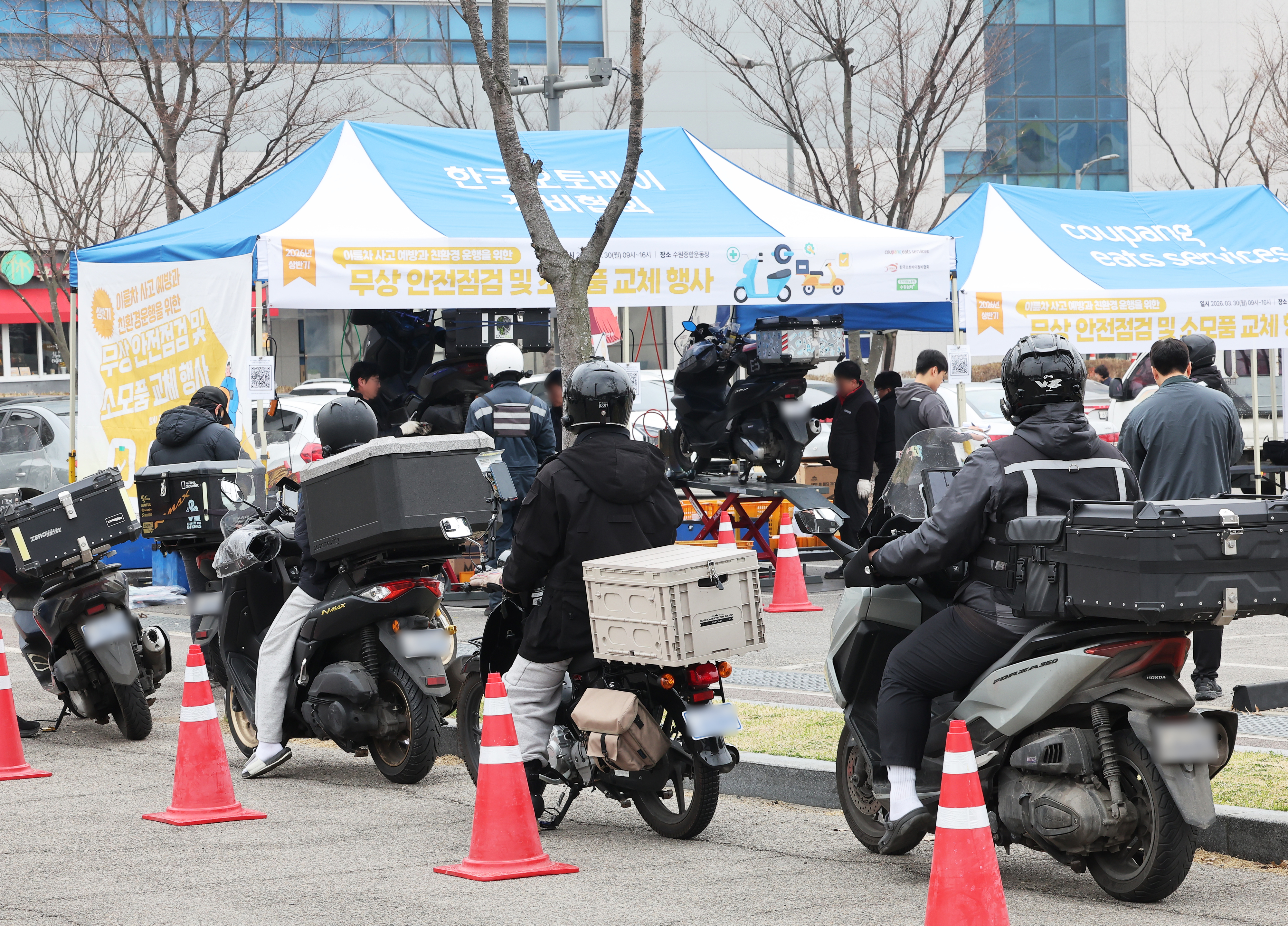 30일 경기 수원시 장안구 수원종합운동장 주차장에서 진행된 ‘2026년 상반기 이륜차 사고 예방과 친환경 운행을 위한 무상 안전 점검 및 소모품 교체 행사’에서 배달업 종사자들이 엔진오일, 브레이크 패드, 전구류 등을 교체하기 위해 대기하고 있다. 이날 행사에는 쿠팡이츠서비스와 한국오토바이정비협회, 경기이동노동자 수원쉼터가 함께했다.