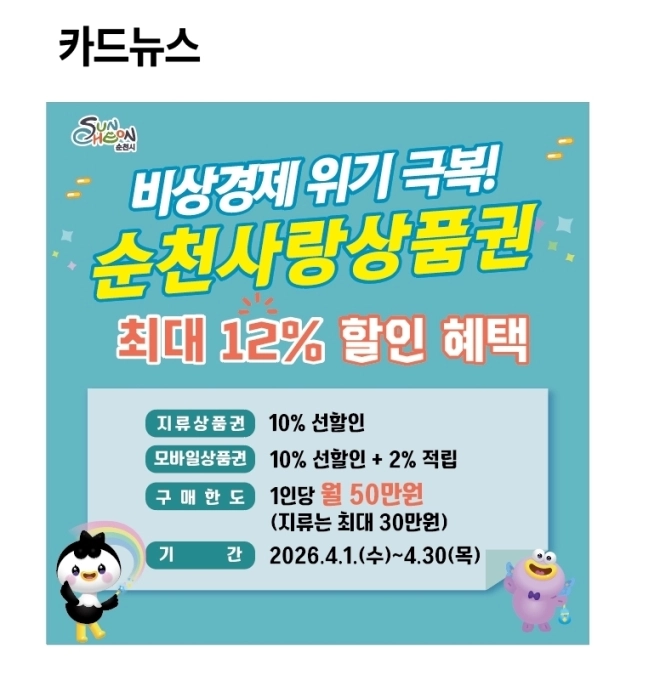 순천시가 4월 한달간 순천사랑상품권 최대 12% 할인행사를 추진한다.