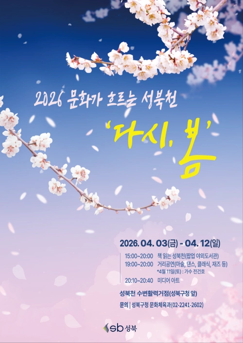 서울 성북구가 주민참여형 복합문화행사인 ‘다시, 봄’과 ‘책 읽는 성북천’을 4월 3일부터 12일까지 성북천 수변 활력 거점 일대에서 진행한다고 31일 밝혔다. 이 기간 오후 3시부터 8시까지는 야외도서관, 오후 7시부터 8시까지는 거리공연을 연계해 운영한다. 시민 누구나 무료로 참여할 수 있다.