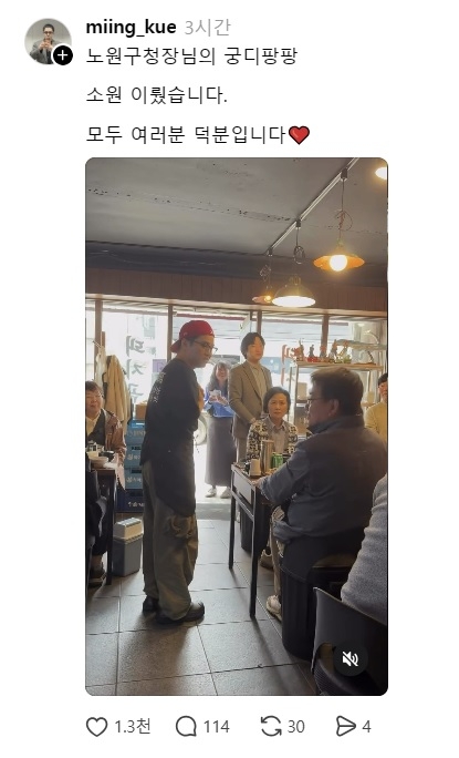 서울 노원구 상계동의 국밥집 사장 박민규씨는 이날 SNS(소셜미디어)에 오 구청장과의 사진을 게재하면서 “노원구청장님의 궁디 팡팡. 소원 이뤘습니다”라고 썼다.