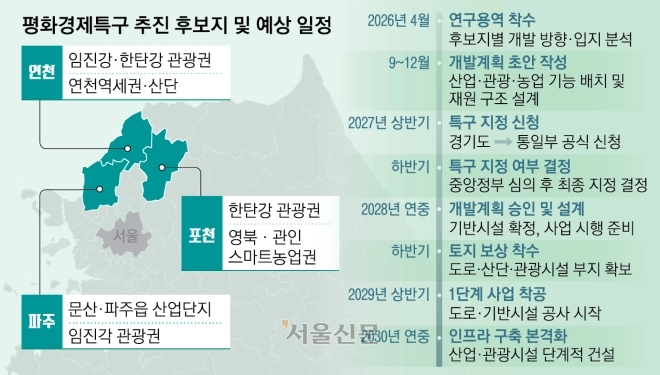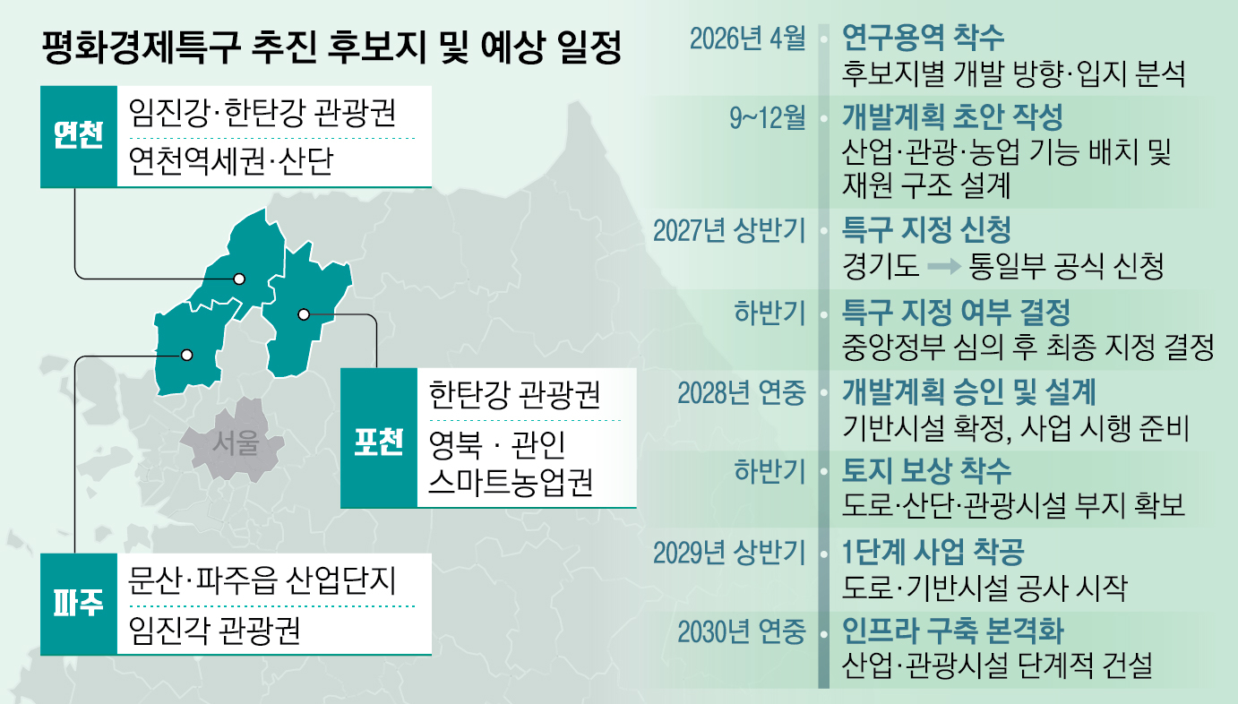 정부가 올해 말부터 내년까지 4곳 안팎의 평화경제특별구역을 단계적으로 지정할 계획을 밝힌 가운데, 경기도가 최근 파주시·연천군·포천시 등 3곳을 전략적 후보지로 선정해 발표했다. 도는 이들 후보지를 대상으로 4월부터 평화경제특구 개발계획 수립을 위한 연구용역에 착수할 예정이다.