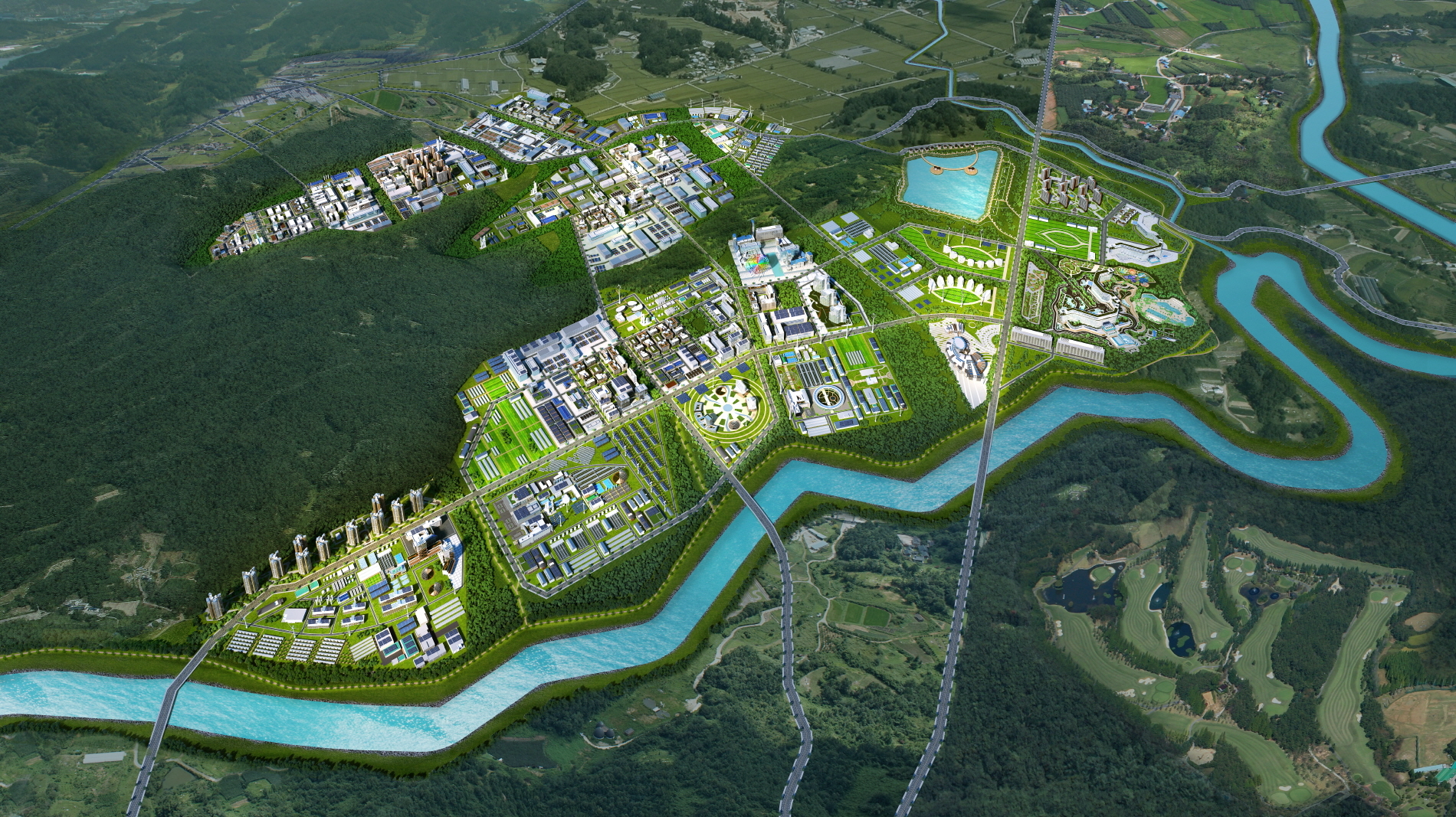 | 포천 평화경제특구 조감도. 예상 면적은 여의도 면적의 약 3.4배인 7.8㎢에 이른다. 강 옆으로 위쪽은 스마트팜과 관광 리조트, 아래쪽은 스마트팜 연구시설을 배치하는 것으로 구상했다. 포천시 제공 |