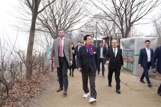 | 지난 2월 도널드 트럼프 미국 대통령의 차남 에릭 트럼프(왼쪽) 트럼프그룹 총괄 부사장이 이현재(왼쪽 두 번째) 경기 하남시장과 K-스타월드 사업 예정지인 미사섬 일대를 둘러보고 있다. 하남시 제공 |