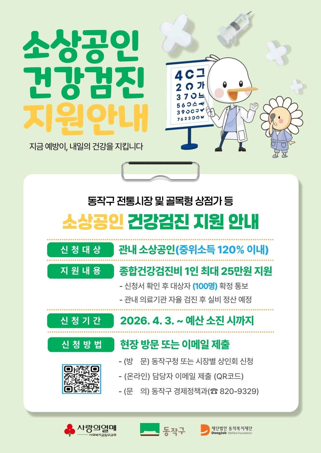 서울 동작구는 경영 부담이 커지면서 건강관리에 소홀해지기 쉬운 소상공인을 위해 ‘소상공인 건강검진비 지원사업’(포스터)을 실시하고 최대 25만원을 지원한다고 3일 밝혔다.