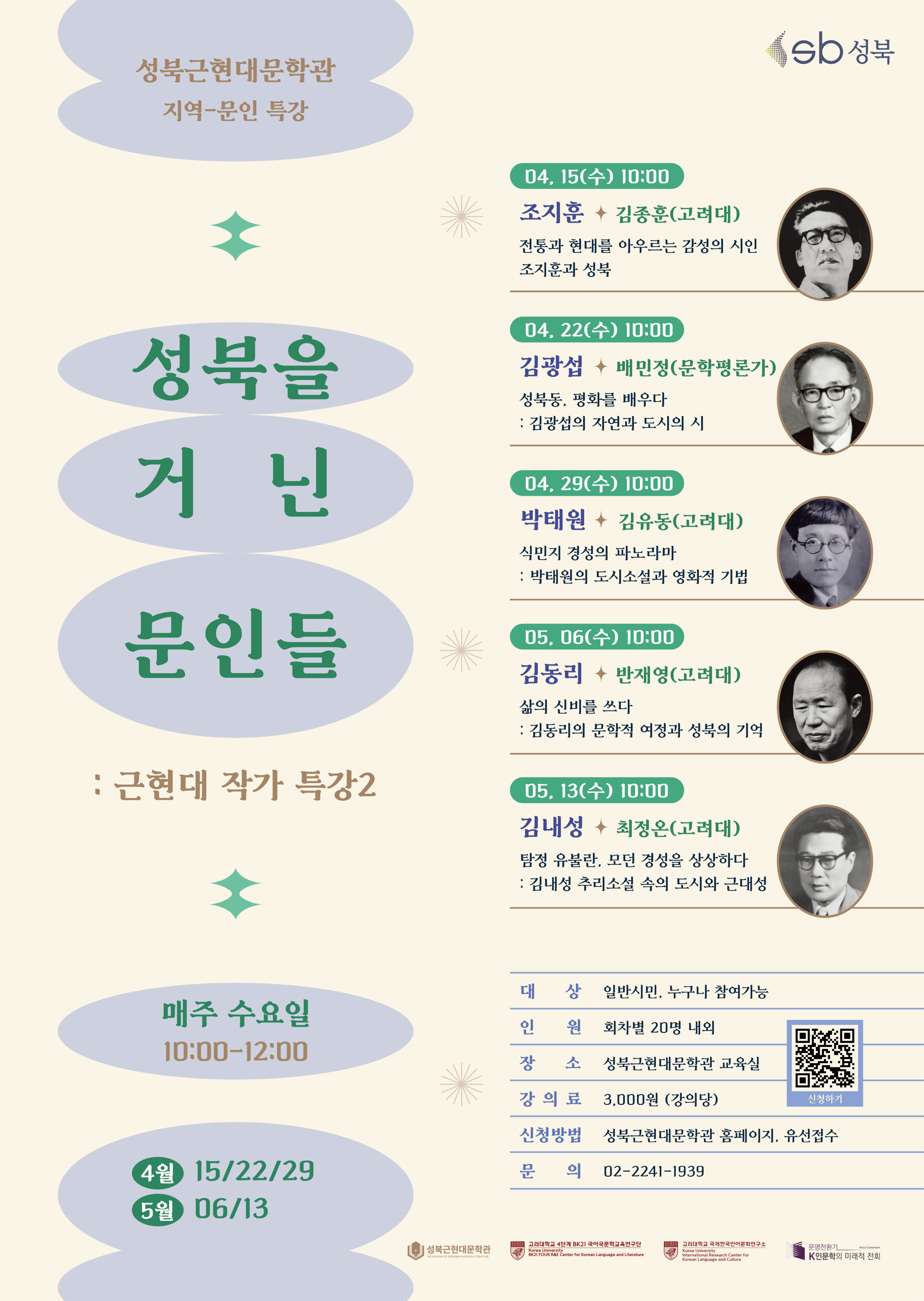 프로그램은 오는 4월 15일부터 5월 13일까지 진행된다. 매주 수요일 오전 10시부터 12시까지 성북근현대문학관 교육실에서 운영된다. 총 5회 진행되며 회차당 정원은 20명 내외다. 수강료는 회차당 3000원이다. 성북근현대문학관 홈페이지 또는 유선 접수로 신청할 수 있다.