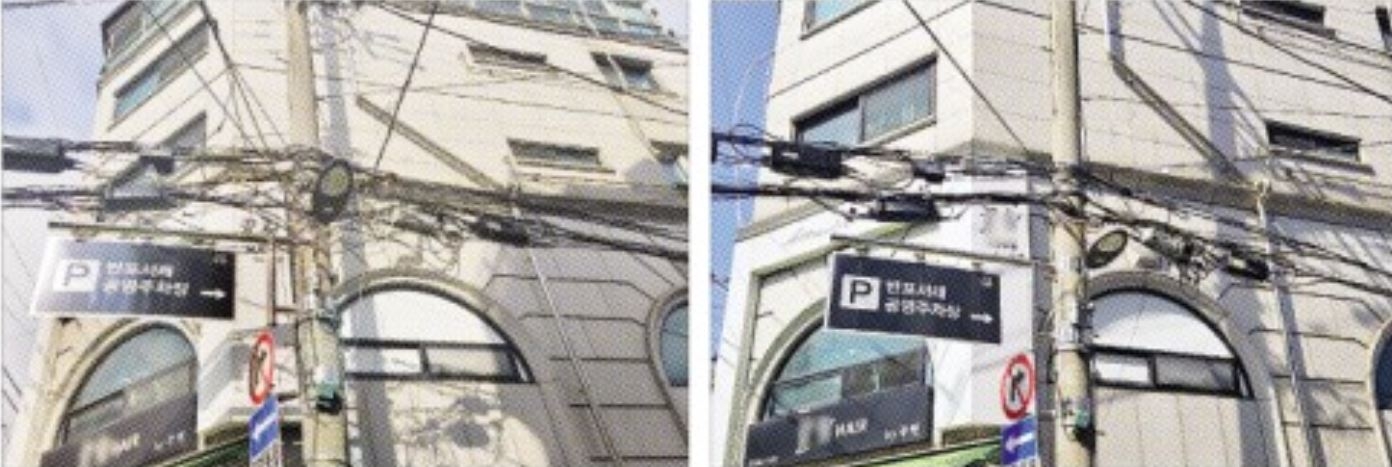 | 서울 서초구는 매년 주택가 공중선(전선) 정비를 대대적으로 하고 있다. 지난해 9월 공중선을 정비하기 전 반포4동 전신주에 전선과 통신선이 얽혀 있는 모습(왼쪽 사진). 오른쪽 사진은 정비 후 깔끔하게 정리된 모습. 서초구 제공 |