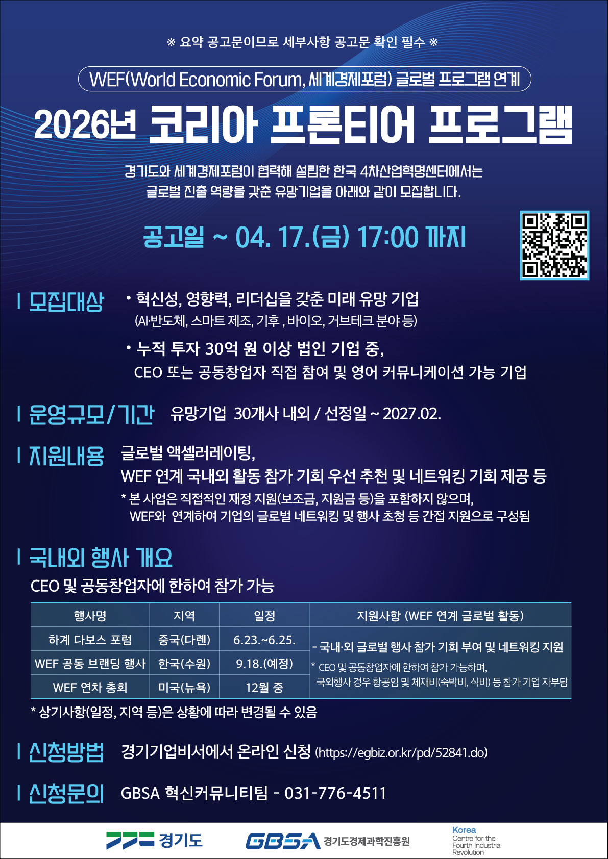 경기도와 경기도경제과학진흥원(경과원)이 운영하는 4차산업혁명센터(C4IR KOREA)가 ‘2026년 코리아 프론티어 프로그램’에 참여할 딥테크 분야 유망 기업 30개 사를 오는 17일까지 모집한다.