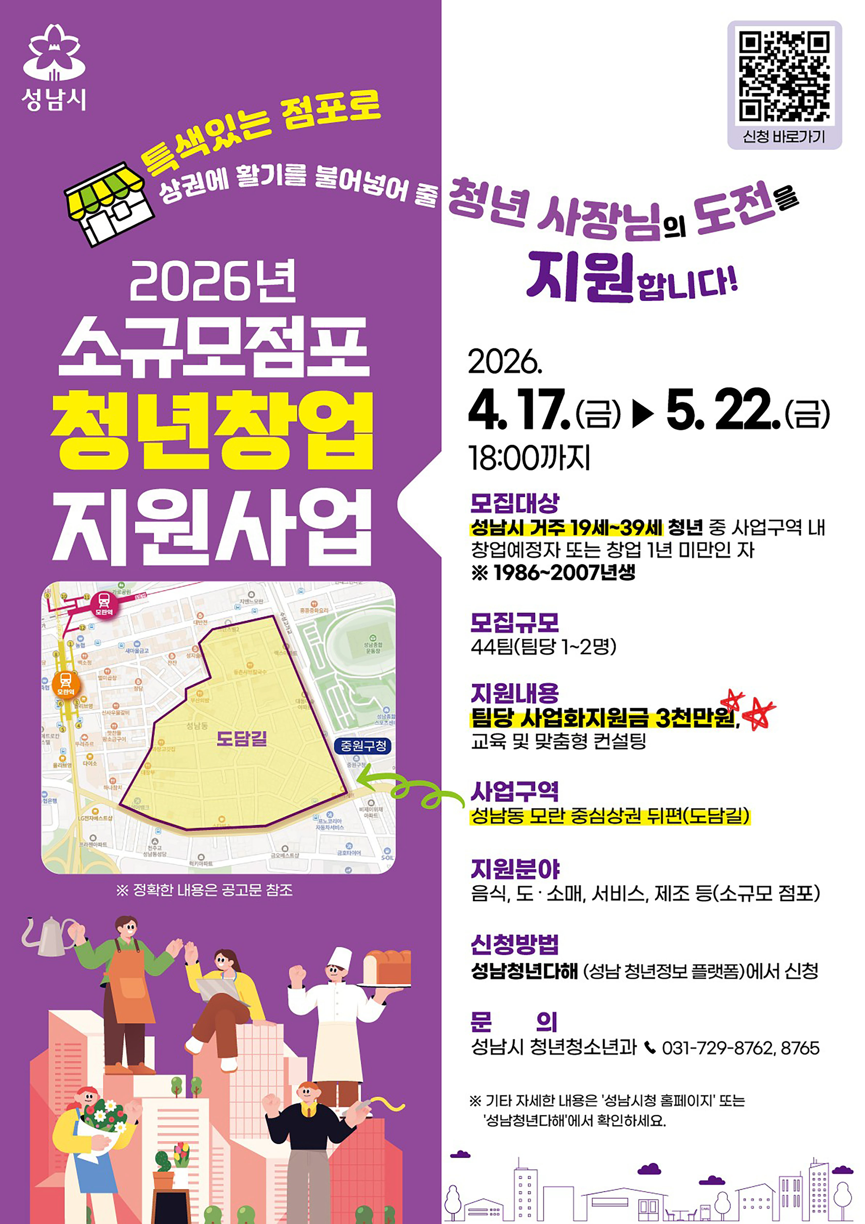 이를 위해 시는 다음달 22일까지 소규모 점포 창업 지원사업에 참여할 청년 창업팀 44곳을 모집한다.지원 대상은 성남시에 거주하면서 도담길에서 창업을 희망하는 19세부터 39세까지 청년이거나 창업 1년 미만의 초기 창업자다. 신청은 1~2명이 팀을 이뤄 할 수 있다.