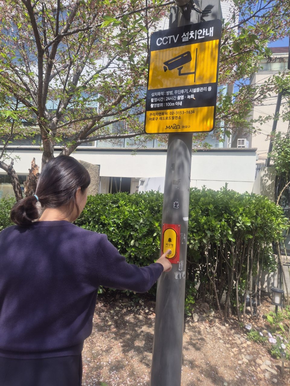 | 서울 마포구가 레드로드 발전소에 설치한 SOS 비상벨을 한 공무원이 시험하고 있다. 이 비상벨을 누르면 폐쇄회로(CCTV)를 통해 주변 상황이 구청 통합관제센터와 경찰, 소방서로 전달된다. 마포구 제공 |