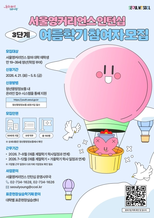 서울시가 ‘서울영커리언스 사업’의 여름 방학 인턴십 참여자 150명을 모집한다고 21일 밝혔다. 국내 최초로 도입된 이 사업은 대학 재학 시기부터 진로 탐색과 실무 경험을 지원하는 맞춤형 정책이다.