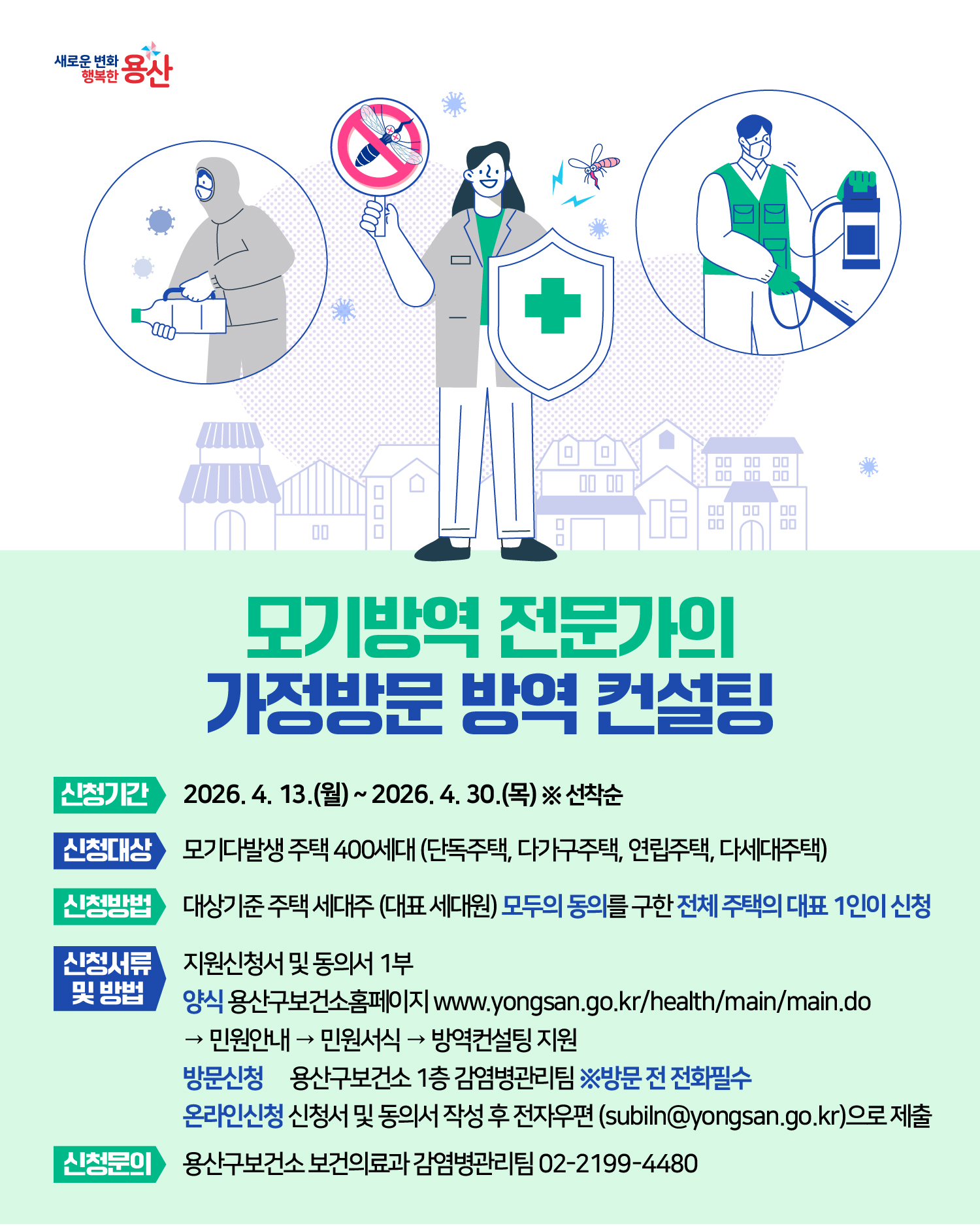 서울 용산구가 다가오는 여름철 모기 매개 감염병 예방과 주민들의 쾌적한 주거 환경 조성을 위해 ‘모기방역 전문가 가정방문 컨설팅’을 500가구로 늘린다고 21일 밝혔다.지난해 300가구를 대상으로 실시했던 컨설팅 사업이 높은 주민 만족도를 기록함에 따른 결과다. 실제로 디지털모기측정기(DMS) 데이터 분석 결과, 2025년 관내 모기 발생률이 전년 대비 약 14.46% 감소하는 등 실질적인 효과가 입증된 바 있다.