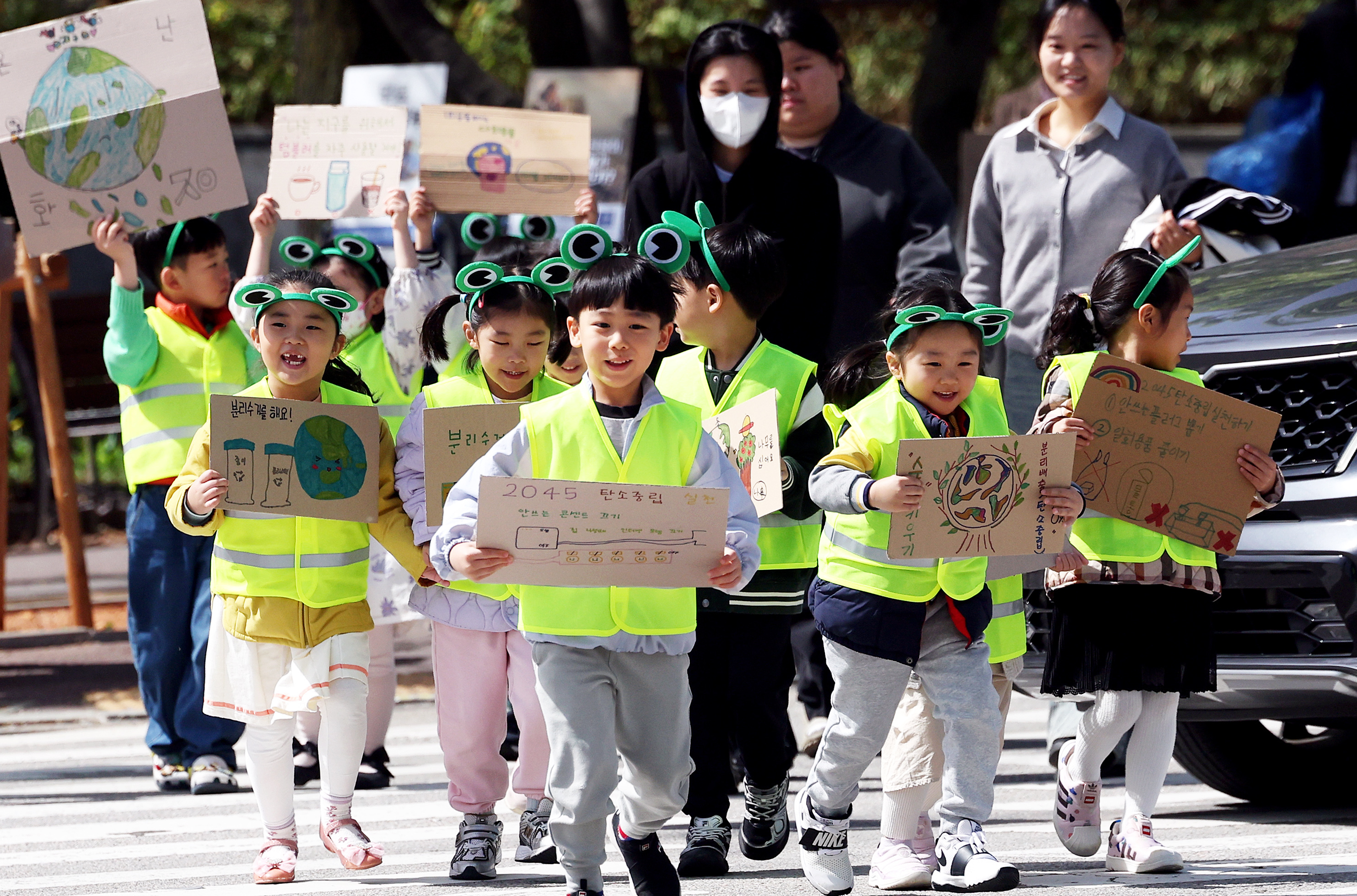 지구의 날을 하루 앞둔 21일 광주 북구청직장어린이집 아이들과 구청 직원들이 북구청 교차로에서 일회용품 사용 자제를 권하는 손팻말을 들고 지구 살리기 행진을 하고 있다.