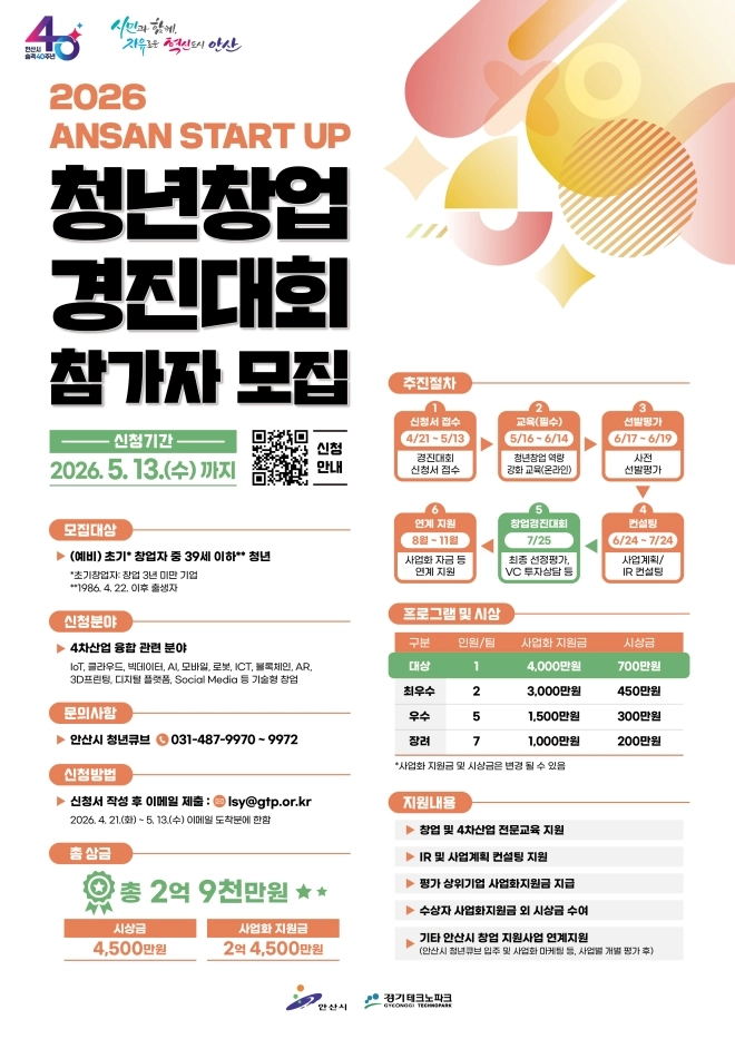 경기 안산시는 창의적인 아이디어를 보유한 청년 창업가를 발굴하기 위해 다음 달 13일까지 ‘2026 안산 스타트업 청년창업 경진대회’ 참가자를 모집한다고 24일 밝혔다.