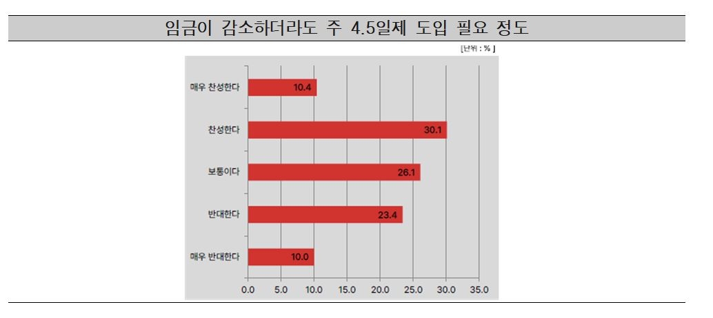○ 나아가 임금이 감소하더라도 주 4.5일제 도입이 필요하다는 의견이 40.5%(매우 찬성 10.4%, 찬성 30.1%)로 응답