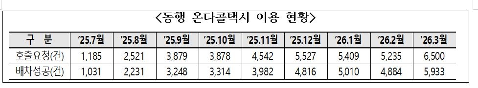 특히 서비스 도입 초기인 2025년 7월(24일)의 하루 평균 49건 대비, 2026년 3월말(31일) 기준 209건으로 이용 건수가 326.5% 증가할 정도로 서비스 출시 이후 지속적으로 이용자가 늘고 있다.