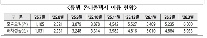 28일 서울시의회 김지향 의원(국민의힘·영등포4)이 서울시로부터 제출받은 ‘동행 온다콜택시 이용 현황’ 자료에 따르면, 2025년 7월 서비스 도입 이후 올 3월 말까지 총 3만 8676건의 호출 요청이 접수됐으며 이 중 3만 4449건이 실제 배차됐다.