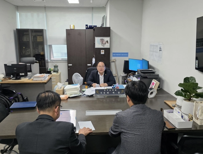 | 박재용 의원이27일 학교 무대시설 접근성 개선과 관련해 경기도교육청 학교안전과 관계자들과 정담회를 갖고, 무대 경사로 및 리프트 설치의 실효성과 안전성 확보 방안을 논의하고 있다.(사진=경기도의회) |
