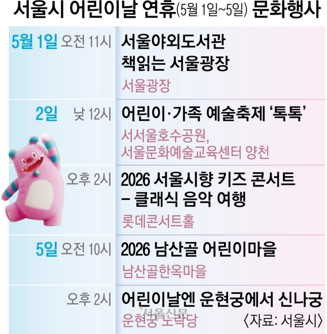 서울이 가정의 달 5월을 맞아 거대한 문화 놀이터로 탈바꿈한다. 서울시는 5월 1일 노동절부터 5월 5일 어린이날까지 도심 곳곳에서 가족이 함께 즐길 수 있는 문화행사를 선보인다고 28일 밝혔다.