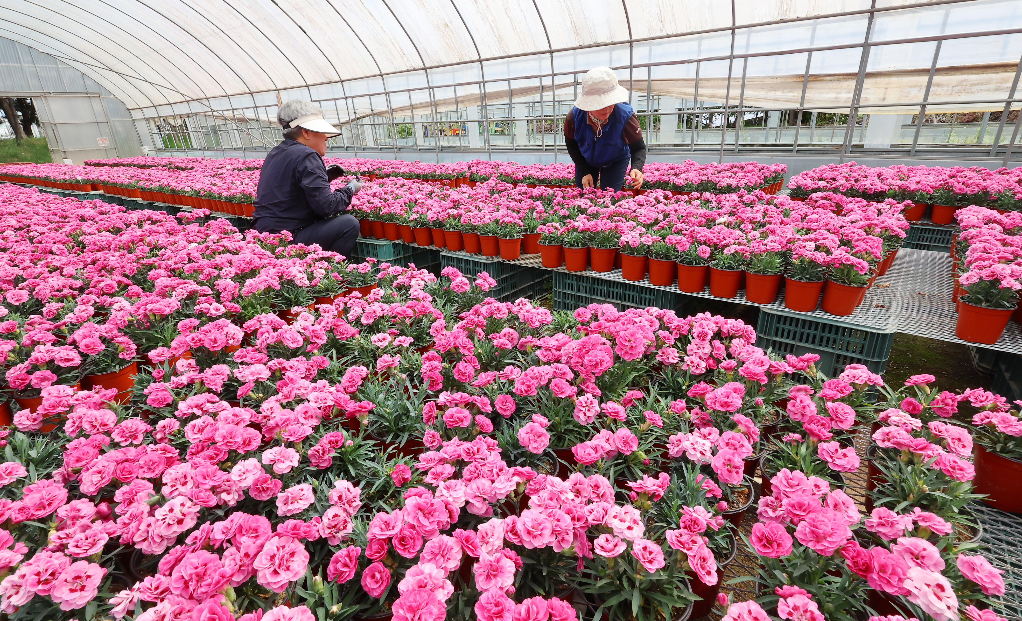 가정의 달인 5월을 앞둔 28일 인천 서구 인천환경공단 청라사업소 직원들이 쓰레기 소각열로 온실 재배한 카네이션을 돌보고 있다. 이 카네이션은 5월 8일 어버이날 즈음에 인천적십자사, 서구청 등을 통해 복지단체와 주민들에게 기부될 예정이다.