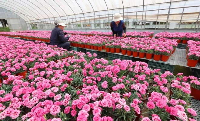 | 쓰레기 소각열로 재배한 카네이션 가정의 달인 5월을 앞둔 28일 인천 서구 인천환경공단 청라사업소 직원들이 쓰레기 소각열로 온실 재배한 카네이션을 돌보고 있다. 이 카네이션은 5월 8일 어버이날 즈음에 인천적십자사, 서구청 등을 통해 복지단체와 주민들에게 기부될 예정이다. 연합뉴스 |