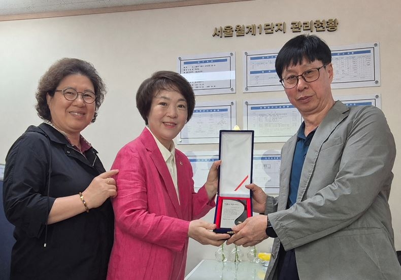 서울시의회 보건복지위원회 소속 신동원 서울시의원(노원1·국민의힘)은 지난 23일 노원구 월계2동 주공1단지 아파트 임차인 대표회의(대표 김명희)로부터 감사패를 받았다. 월계 지역 숙원사업이었던 노후 방음벽 교체와 주거 환경 개선에 기여한 공로다.