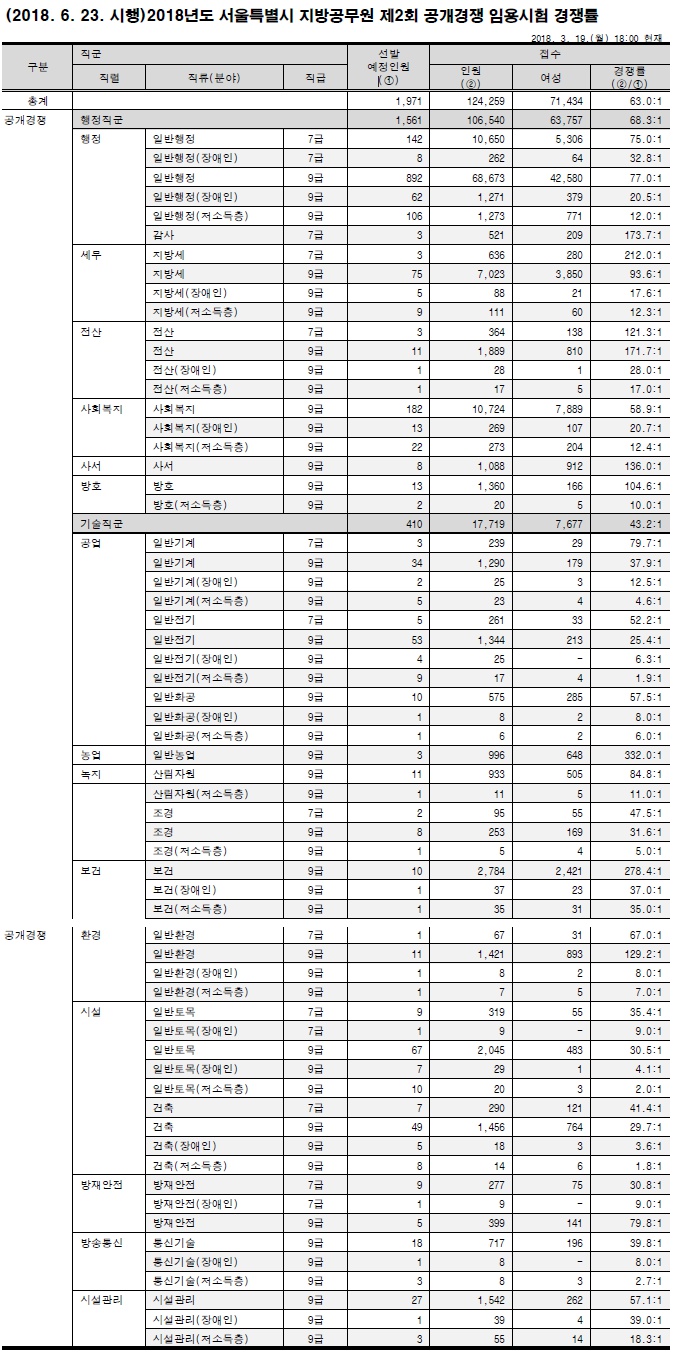 2018년도 서울특별시 지방공무원 제2회 공개경쟁 임용시험 경쟁률(최종)