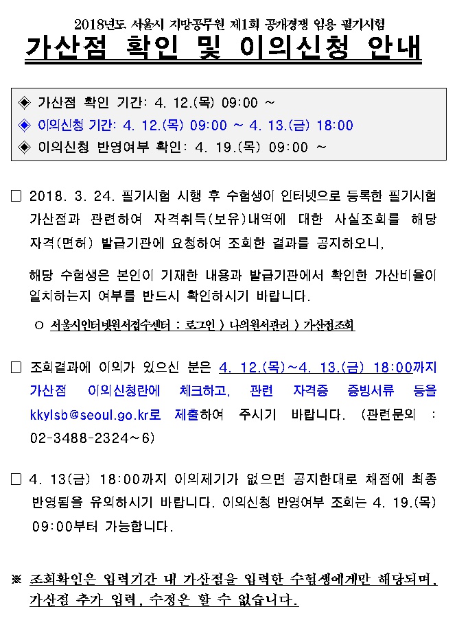 2018년도 서울시 지방공무원 제1회 공개경쟁 임용 필기시험 가산점 확인 및 이의신청 안내