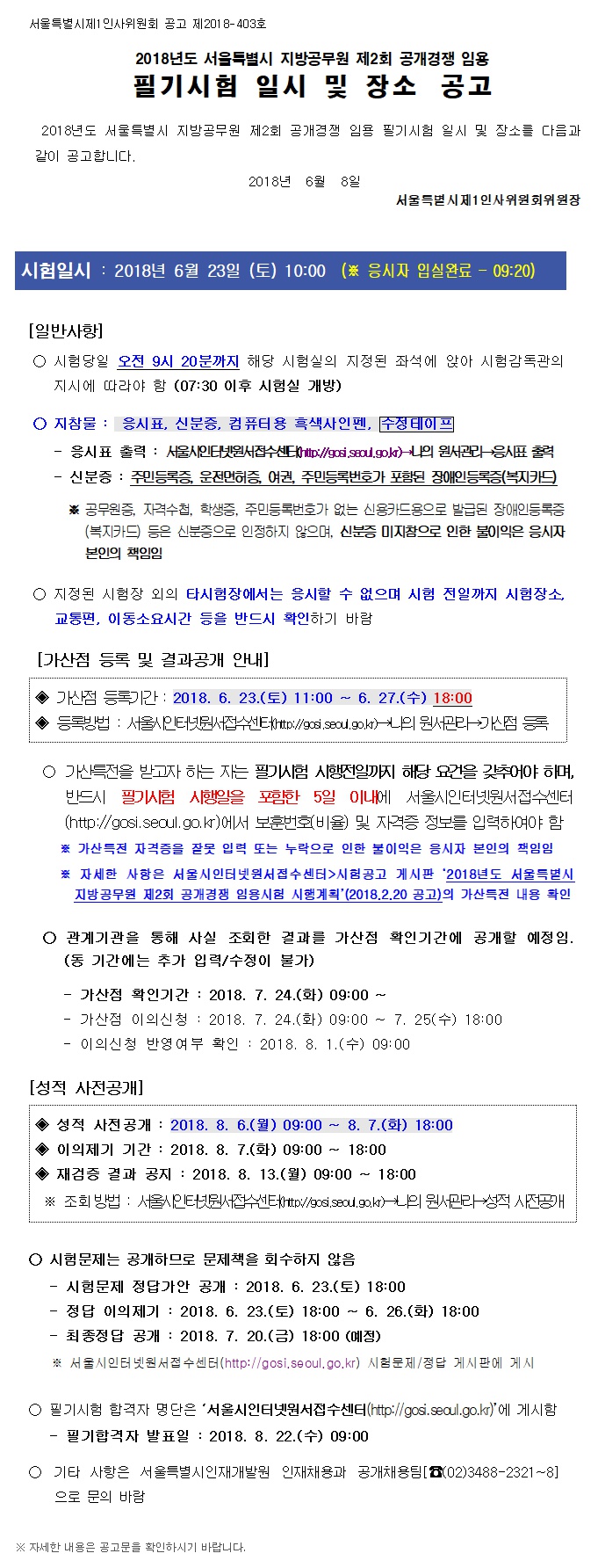2018년도 서울특별시 지방공무원 제2회 공개경쟁 임용 필기시험 일시 및 장소 공고