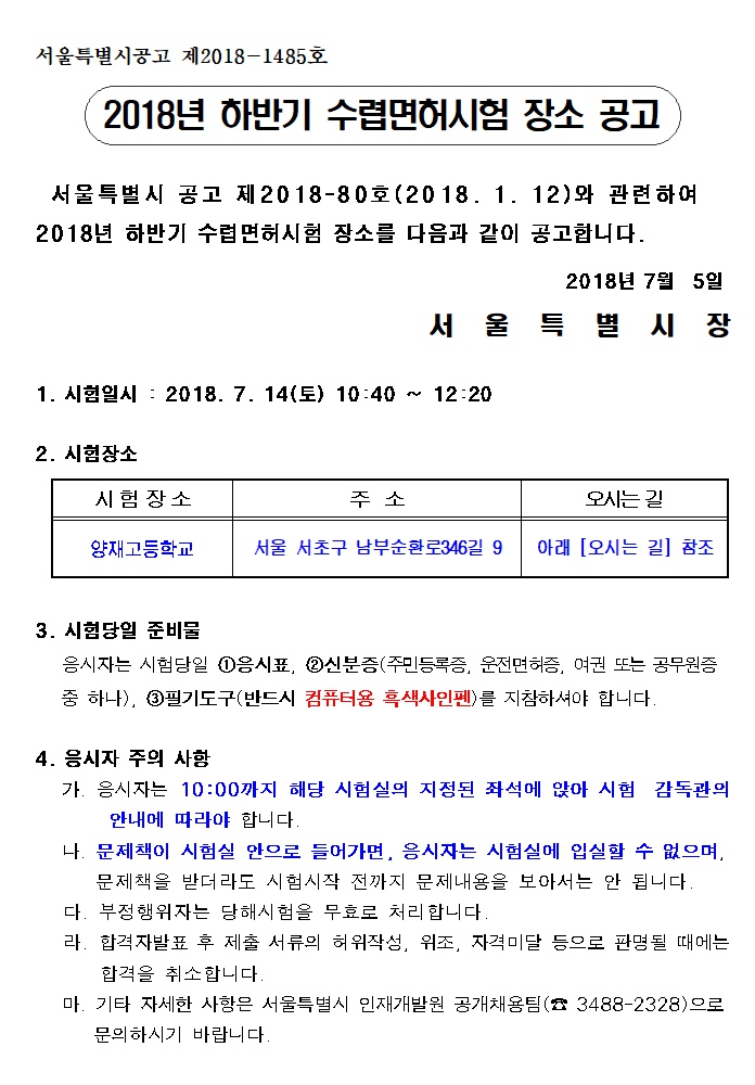 2018년 하반기 수렵면허시험 장소 공고(7. 14.(토), 양재고등학교)