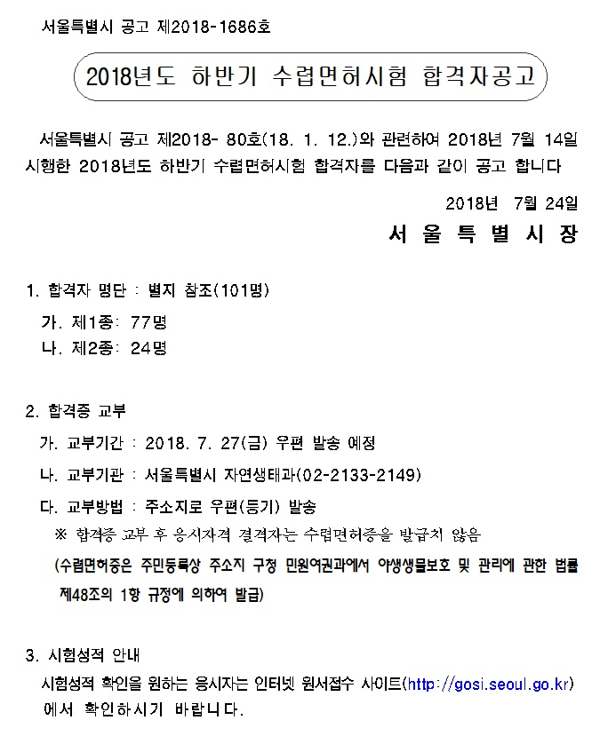 2018년도 하반기 수렵면허시험 합격자공고