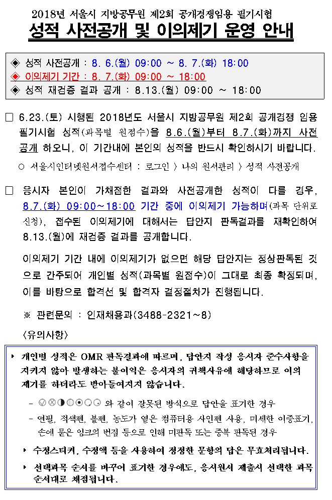 2018년 서울시 지방공무원 제2회 공개경쟁임용 필기시험 성적 사전공개 및 이의제기 운영 안내