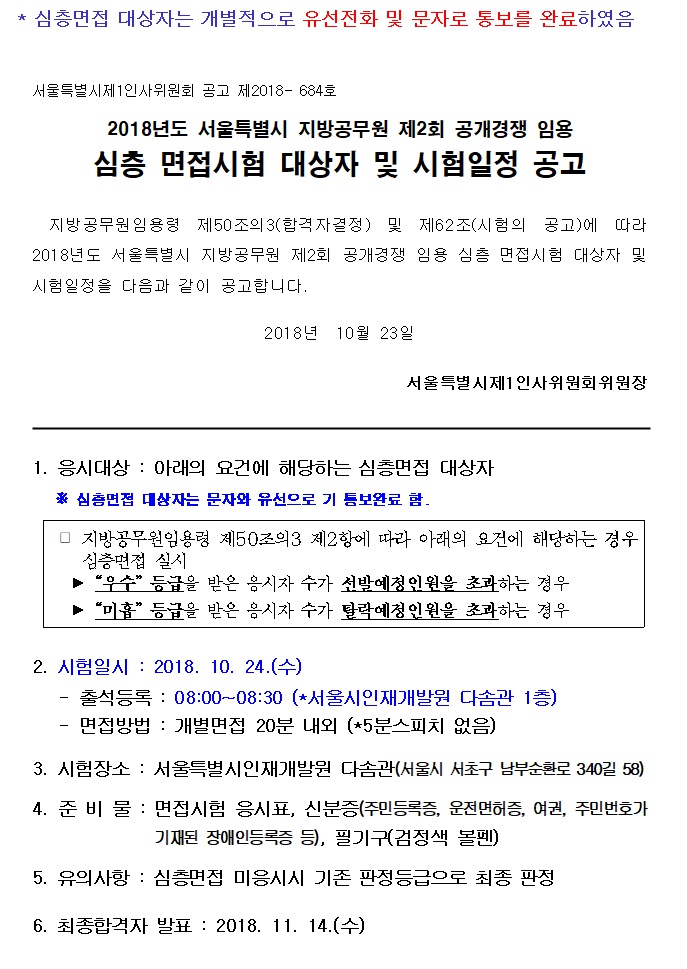 2018년도 서울특별시 지방공무원 제2회 공개경쟁 임용 심층 면접시험 대상자 및 시험일정 공고