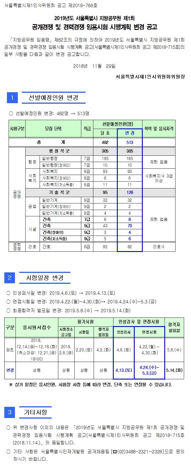 2019년도 서울특별시 지방공무원 제1회 공개경쟁 및 경력경쟁 임용시험 시행계획 변경 공고