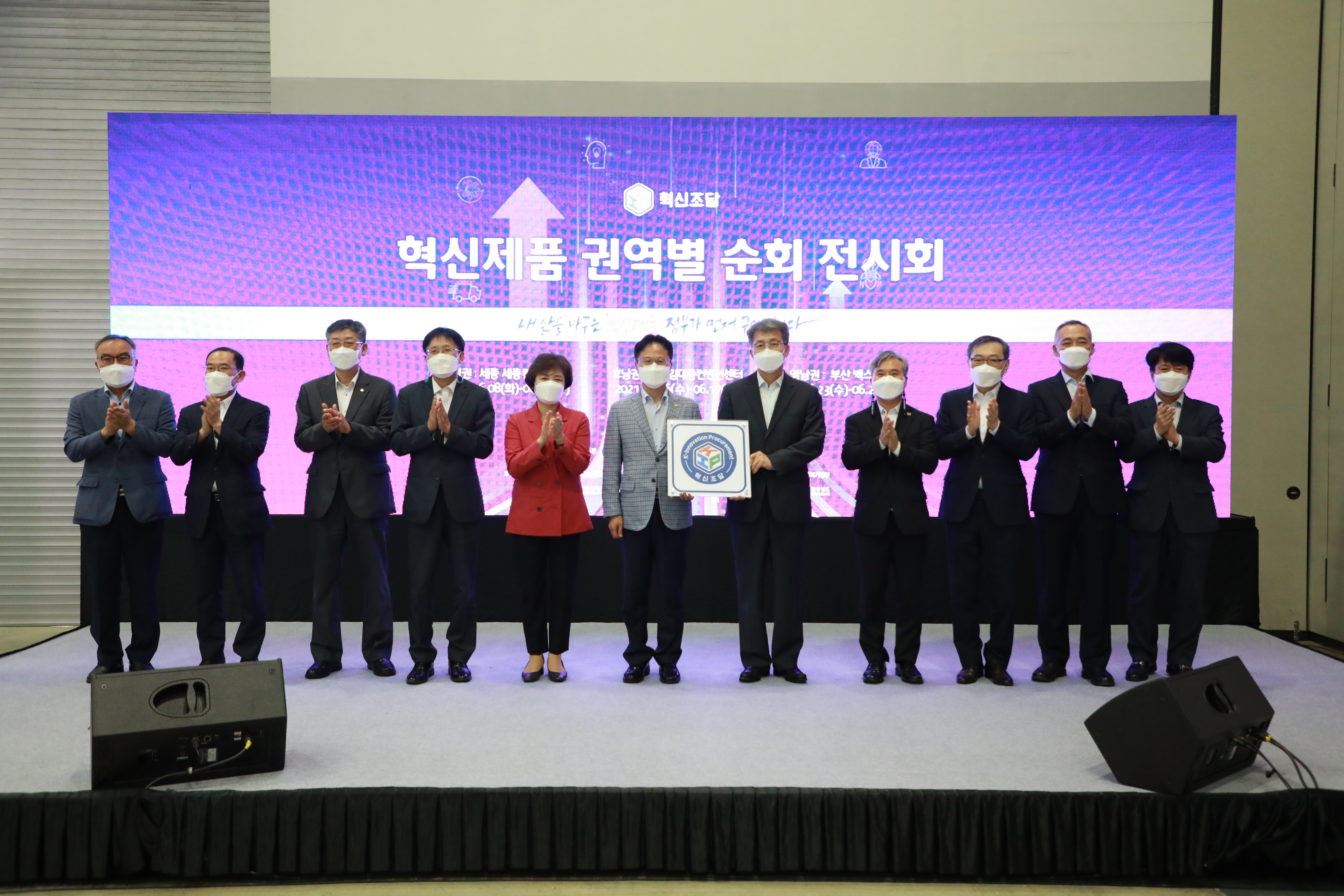 ▶ 김정우 조달청장(사진 왼쪽에서부터 여섯번째)이 23일 부산 벡스코에서 개최된 혁신제품 영남권 전시회에서 전시회 참석자들과 기념촬영을 하고 있다.
