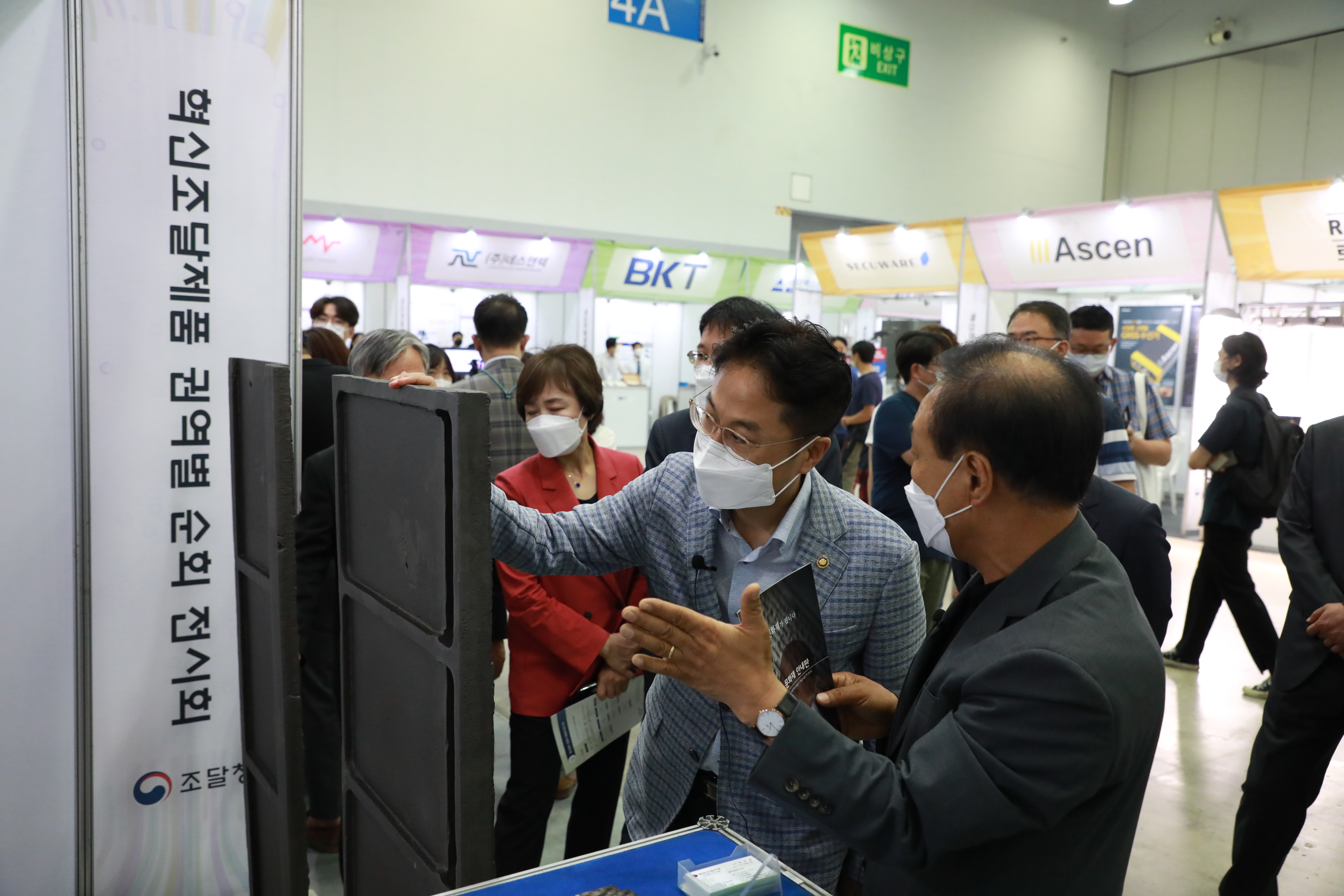 ▶ 김정우 조달청장(사진 오른쪽에서부터 두번째)이 23일 부산 벡스코에서 개최된 혁신제품 영남권 전시회에서 참여기업으로부터 제품 설명을 듣고 있다.