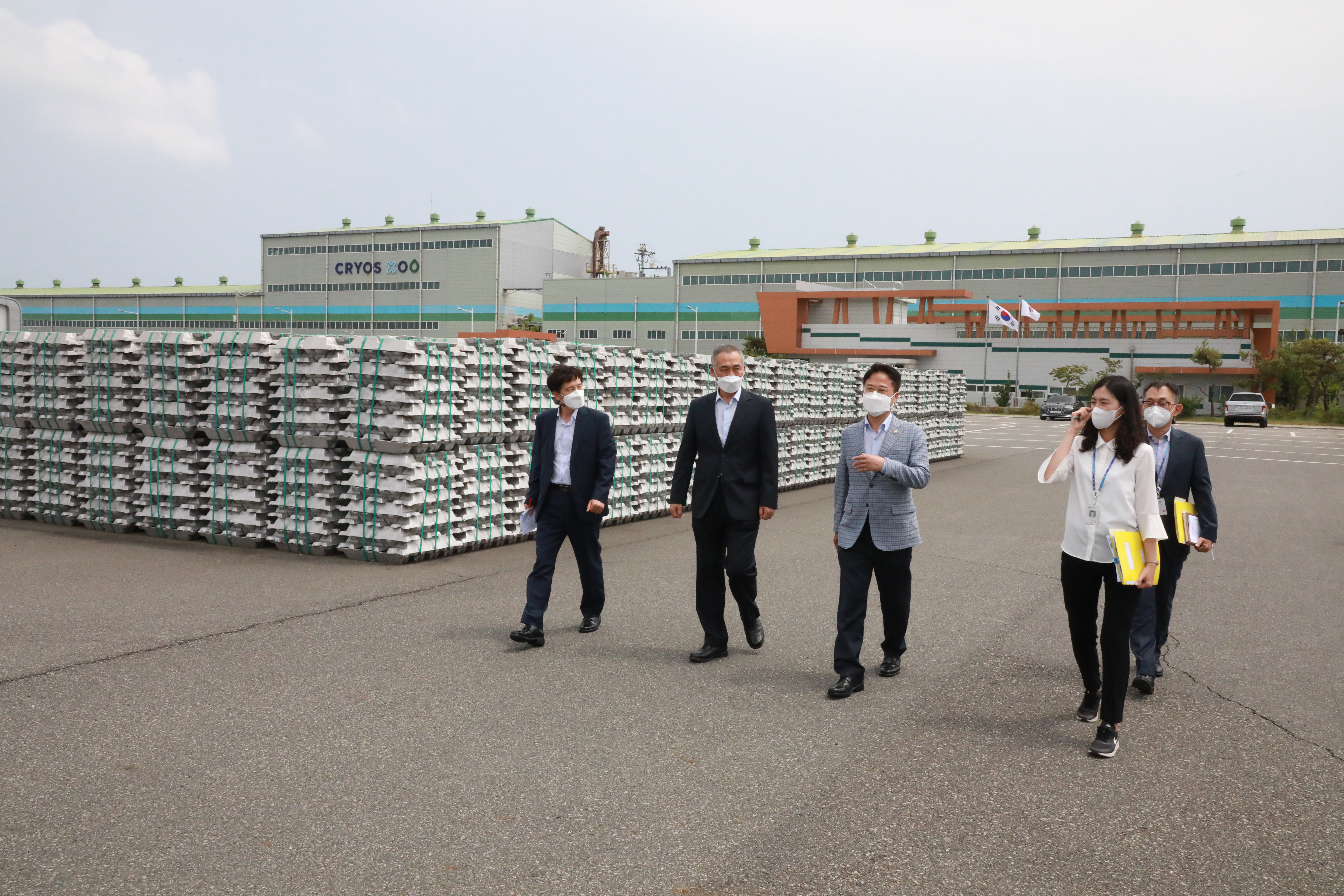 ▶ 김정우 조달청장(사진 왼쪽에서부터 세번째)이 23일 부산비축기지를 방문하여 알루미늄 등 원자재 비축현황을 점검하고 있다.
