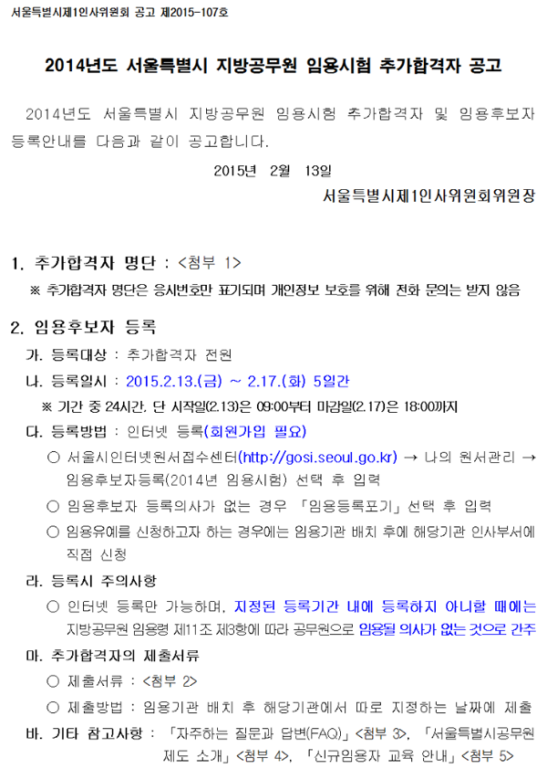 2014년도 서울특별시 지방공무원 임용시험 추가합격자 공고