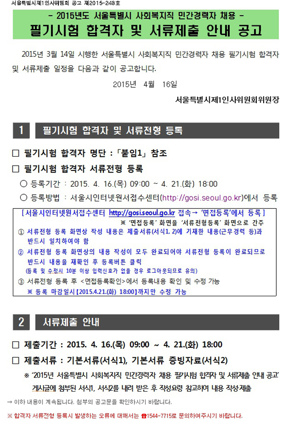 필기시험 합격자 - 2015년도 서울특별시 사회복지직 민간경력자 채용