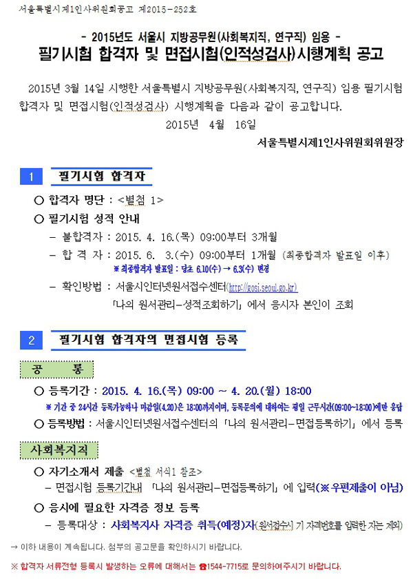 필기시험 합격자 - 2015년도 서울시 지방공무원(사회복지직, 연구직) 임용