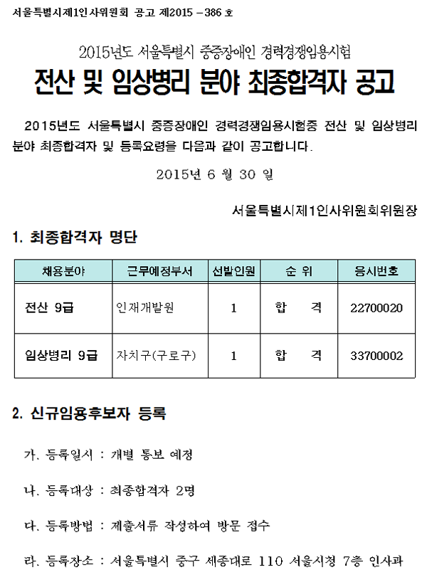 최종합격자 - 2015년도 서울특별시 중증장애인 경력경쟁임용시험 전산 및 임상병리 분야