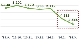 계란 가격 추이 : (‘23.9월) 5,130원/30개 → (11) 5,120 → (’24.1) 5,112 → (3) 4,668