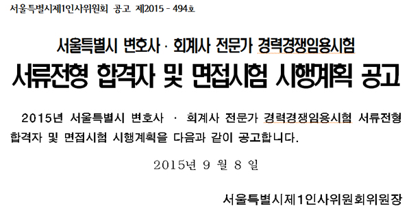 서울특별시 변호사·회계사 전문가 경력경쟁임용시험 서류전형 합격자 및 면접시험 시행계획 공고