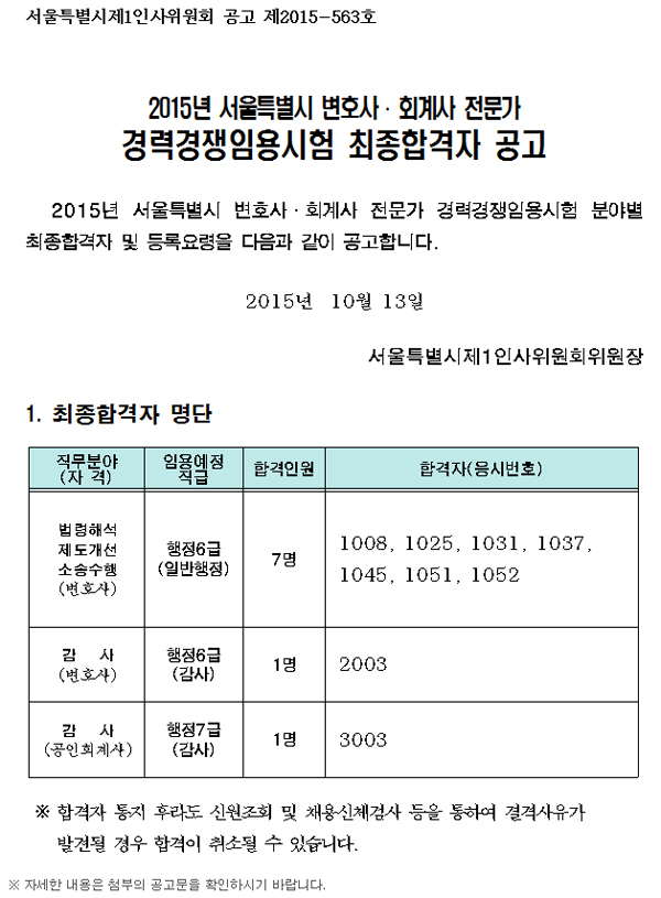 최종합격자 - 2015년 서울특별시 변호사 ? 회계사 전문가 경력경쟁임용시험