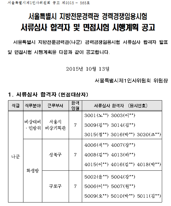 서류심사 합격자 및 면접 - 서울특별시 지방전문경력관 경력경쟁임용시험