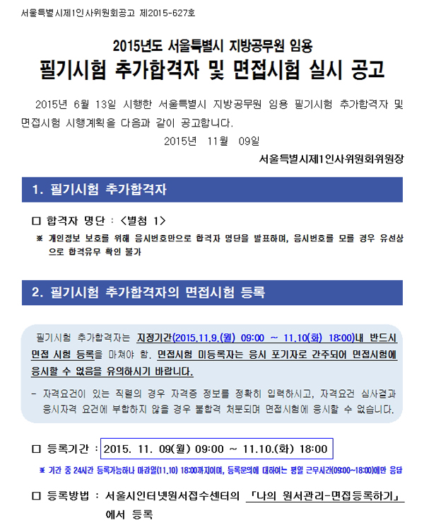 추가합격 - 2015년도 서울특별시 지방공무원 임용시험