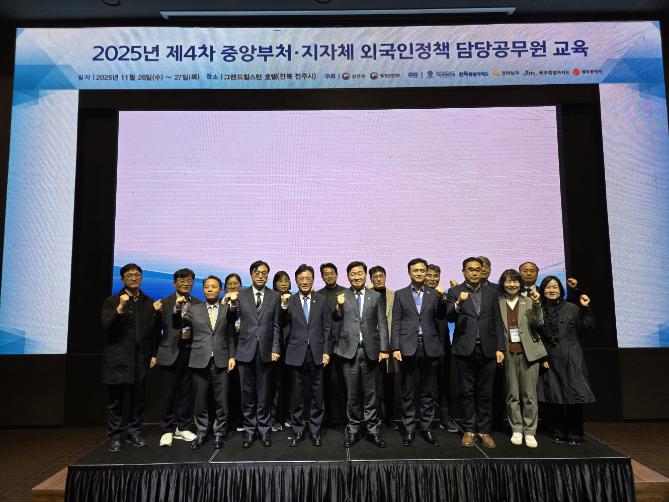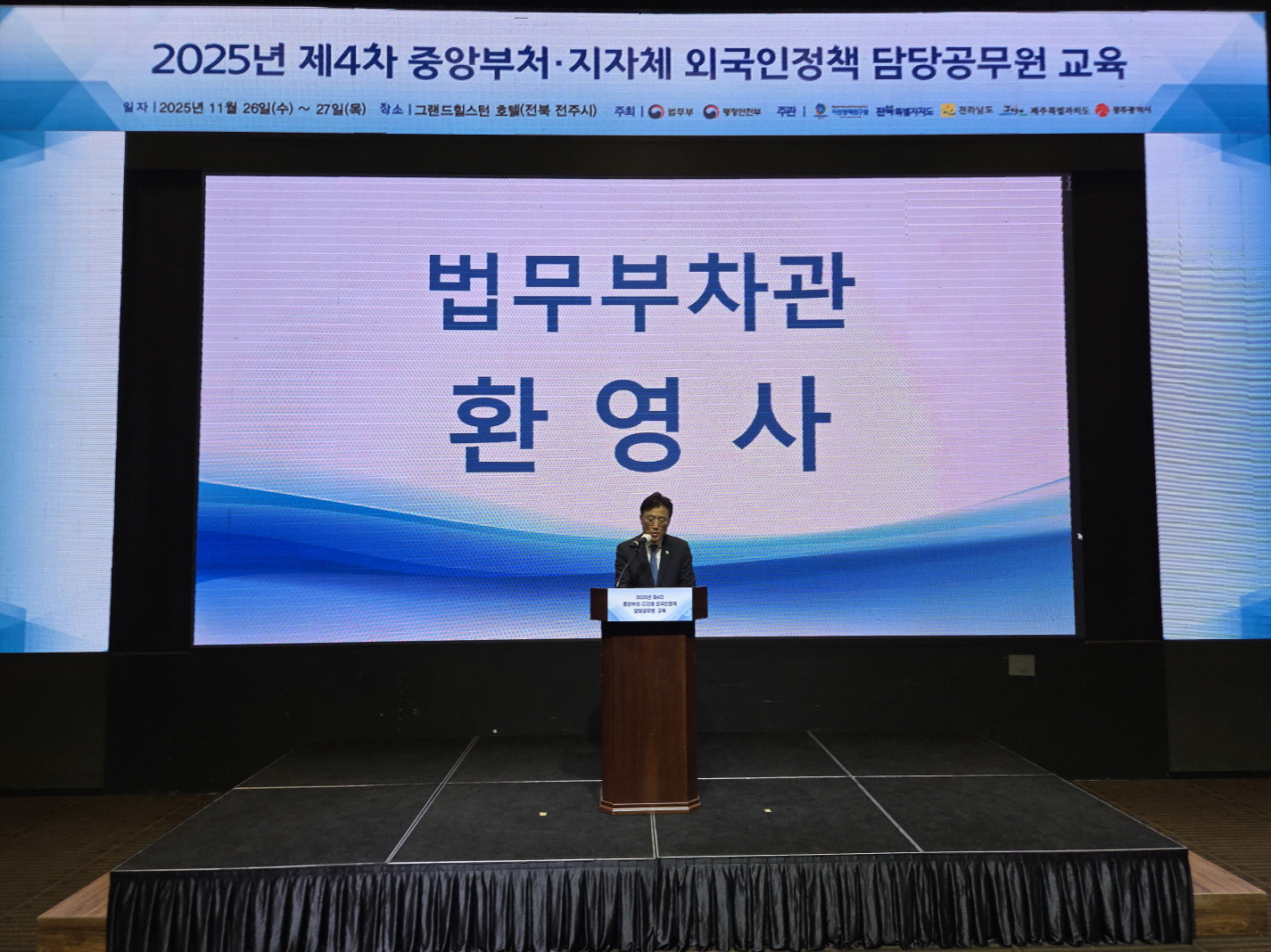 이진수 법무부차관은 '25. 11. 26.(수) 전주시 그랜드힐스턴 호텔에서 개최한 '전라권·제주 지역 지자체 외국인정책 담당공무원 교육' 현장을 방문하여 지역과 상생하는 외국인정책 추진의 중요성을 강조하였다.