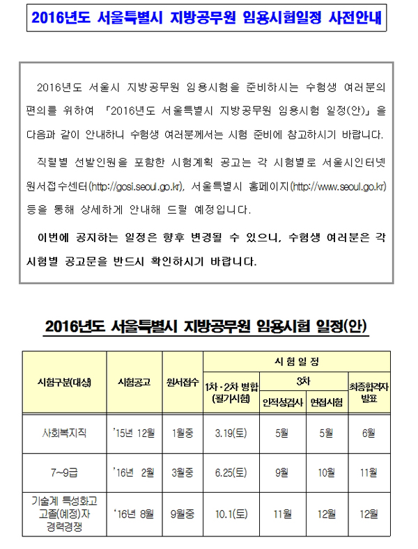 2016년도 서울특별시 지방공무원 임용시험 일정 사전안내