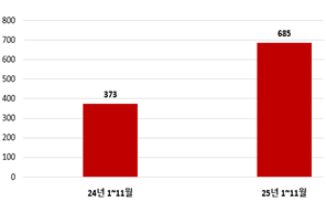 ('24년 1~11월) 373건 → ('25년1~11월) 685건 | ('24년 1~11월) 135건 → ('25년1~11월) 261건 |