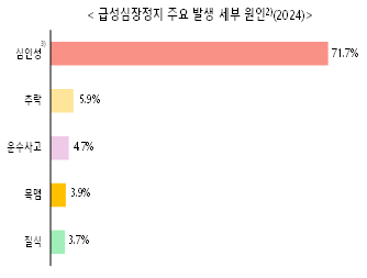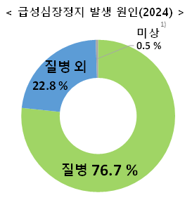 119구급대가 이송한 환자 중 의무기록조사를 완료한 환자는 32,850건(완료율 99.4%)이며, 조사 결과 급성심장정지 환자의 주요 발생 원인은 심근경색, 부정맥, 뇌졸중 등 질병에 의한 경우가 76.7%, 추락, 운수사고 등 질병 외인으로 인한 경우가 22.8%로 나타났다. 특히 심장 자체의 기능부전에 의한 심인성 원인이 전체의 71.7%를 차지하였다(그림 2 참고).