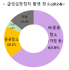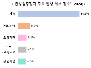 급성심장정지 환자는 도로/고속도로, 상업시설 등의 공공장소(18.1%)보다 비공공장소에서 많이 발생(63.8%)하였으며, 그 중에서도 특히 가정에서의 발생이 전체의 44.8%로 가장 많았다(그림 3 참고).